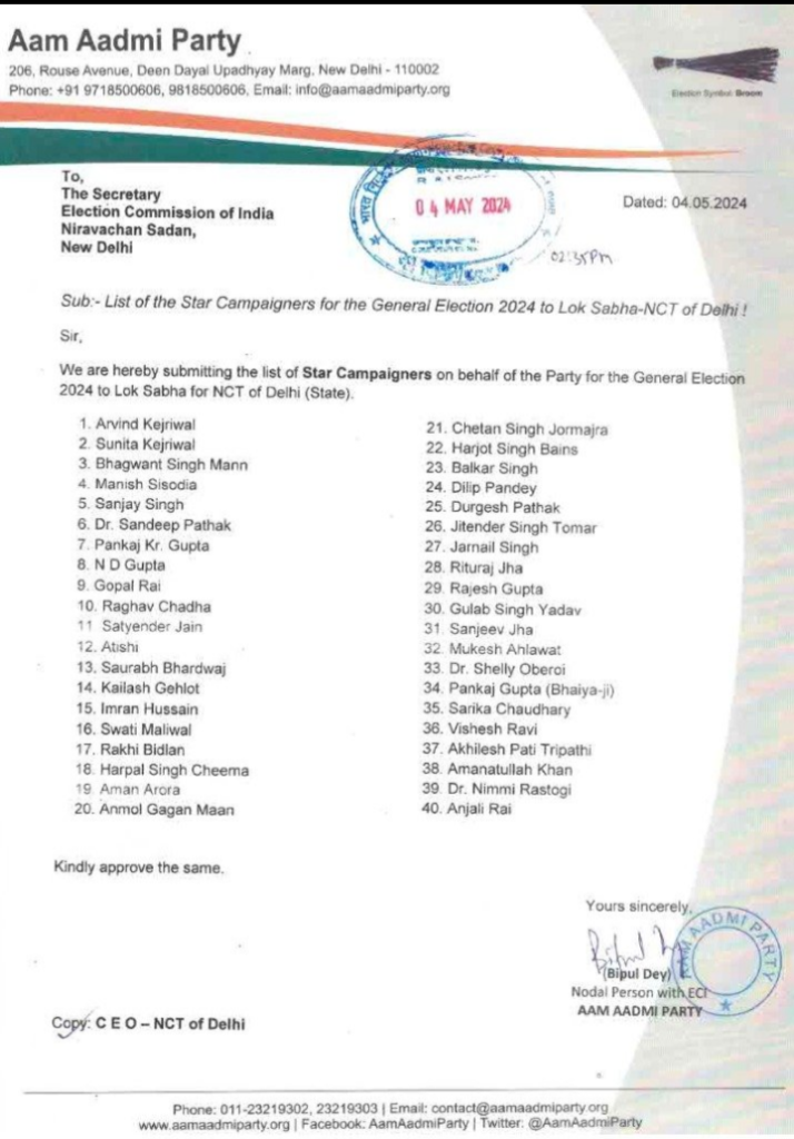 अरविंद केजरीवाल सुनीता केजरीवाल भगवान सिंह मान मनीष सिसोदिया संजय सिंह डॉक्टर संदीप पाठक पंकज कुमार गुप्ता एनडी गुप्ता गोपाल राय राघव चड्ढा सत्येंद्र जैन आतिशी सौरभ भारद्वाज कैलाश गहलोत इमरान हुसैन स्वाति मालीवाल राखी बिड़लान हरपाल सिंह चीमा अमन अरोरा अनमोल गगन मान चेतन सिंह हरजोत सिंह बैंस बालकार सिंह दिलीप पांडे दुर्गेश पाठक जितेंद्र सिंह तोमर, जरनैल सिंह ऋतुराज झा राजेश गुप्ता गुलाब सिंह यादव संजीव झा मुकेश अहलावत डॉक्टर शैली ओबेरॉय पंकज गुप्ता (भैया जी सारिका चौधरी विशेष रवि अखिलेश पति त्रिपाठी अमानतुल्लाह खान डॉक्टर निम्मी रस्तोगी अंजली राय