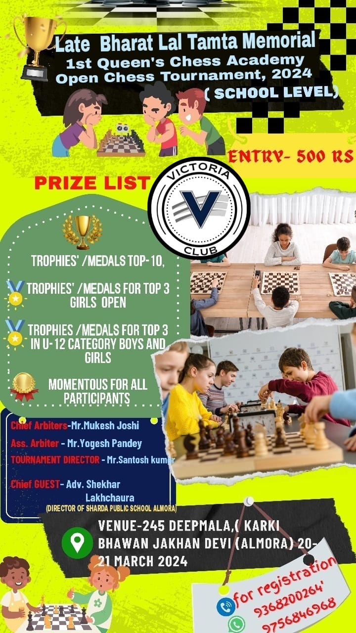 अल्मोड़ा क्वींस चेस एकेडमी एवं विक्टोरिया क्लब अल्मोड़ा द्वारा खेल व खिलाडियों को बढ़ावा देने के लिये कल दिनाक 20.03.2024 बुधवार से स्वर्गीय भरत लाल टम्टा जी की स्मृति में दो दिवसीय जिला स्तरीय ओपन शतरंज प्रतियोगिता (विद्यालय स्तर) 2024 का आयोजन 245- दीपमाला कार्की भवन जाखनदेवी अल्मोड़ा में दोपहर 1 बजे से किया जाना सुनिश्चित हुआ है। प्रतियोगिता में 8 स्कूलों के शतरंज खिलाड़ी प्रतिभाग करने जा रहे हैं। यह जानकारी क्वींस चेस एकेडमी के निदेशक संतोष कुमार ने दी। आयोजक मंडल ने सभी खेल प्रेमियों से खेल व खिलाडियों का उत्साहवर्धन करने के लिए  प्रतियोगिता में आने का अनुरोध किया है।