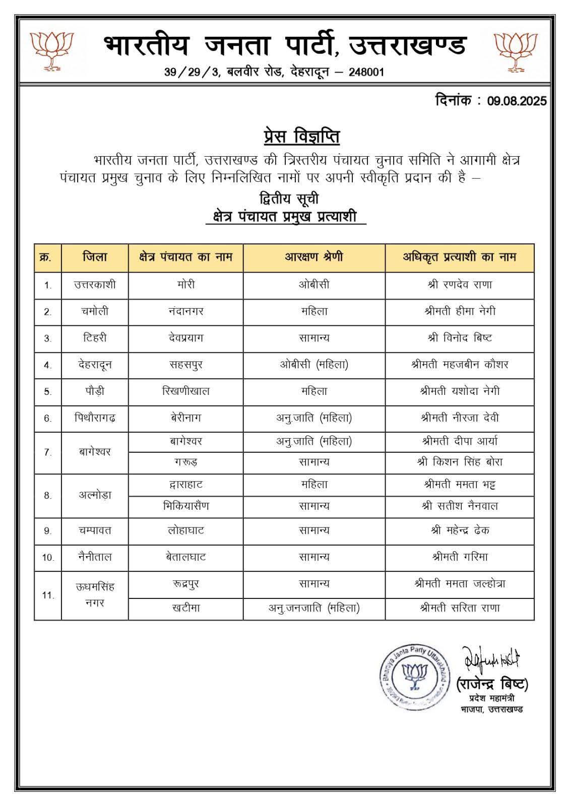 अल्मोड़ा। भाजपा ने ब्लाक प्रमुख पद के दो ओर उम्मीदवारों की घोषणा कर दी है। इनमें द्वाराहाट से