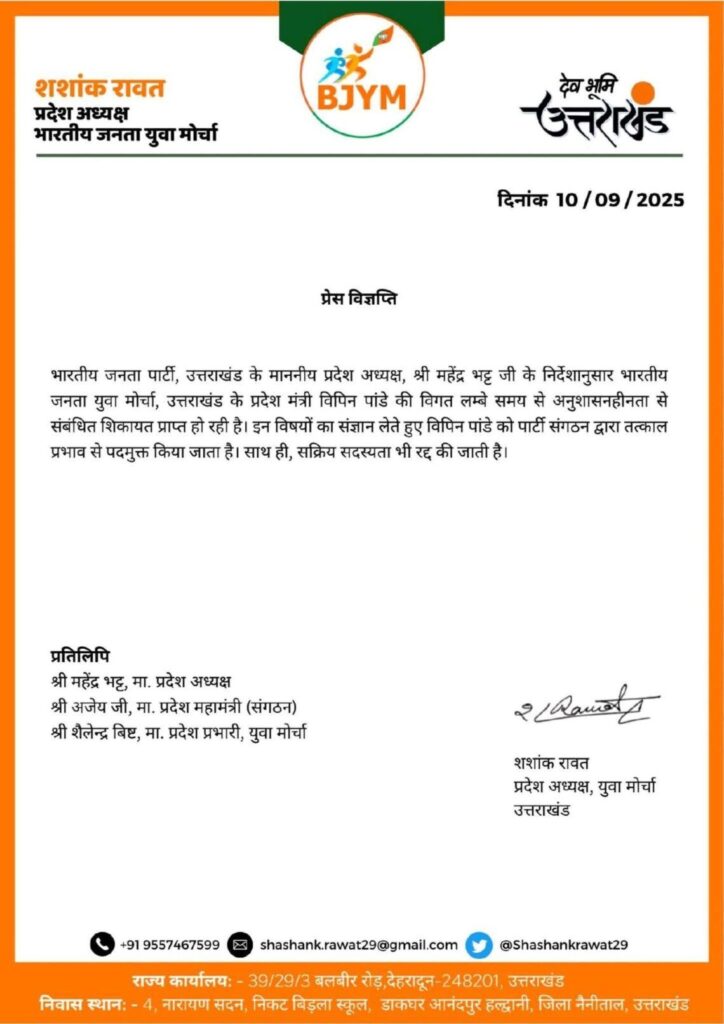प्रदेश अध्यक्ष महेंद्र भट्ट के निर्देश पर भारतीय जनता युवा मोर्चा के प्रदेश मंत्री विपिन पांडे को अनुशासन हीनता के चलते पदमुक्त कर उनकी सक्रिय सदस्यता समाप्त कर दी गई है।। विपिन पांडे लंबे समय से सोशल मीडिया पर सक्रिय रहते हुए विवादों में रहे हैं। कल भी एसएसपी नैनीताल कार्यालय में एक मुकदमे को लेकर धरना प्रदर्शन कर पुलिस की समझाइश की अनदेखी की।